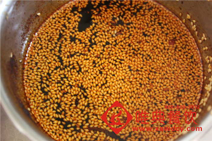 將五斤油燒到240度,涼到180度放入混合料55克、撈出混合料渣,170度放芝麻、160度加辣椒面6兩(中粗5兩、1兩細(xì)辣椒面),醋少許 蓋上第二天使用,這樣顏色、味道會(huì)更好!